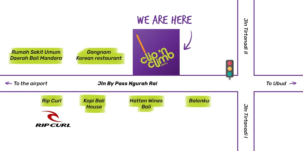 We’re located at Clip’n Climb Bali 524 bypass Ngurah rai – Denpasar Selatan – Sanur Kauh